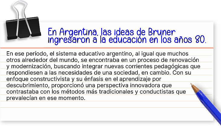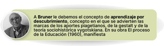 Como señalamos, en Bruner se advierten las huellas de sus antecesores constructivistas, Piaget y Vygotsky, quienes enfatizaron en cómo los individuos construyen activamente su conocimiento a través de la experiencia y la interacción social.